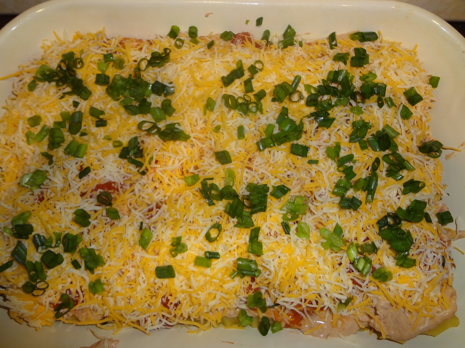 This layer gets topped with the last of the chicken mixture, and I still had some green onions, so I added them.